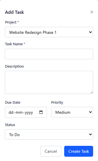 Click “Add Task,” select project, enter details, click “Create Task.”