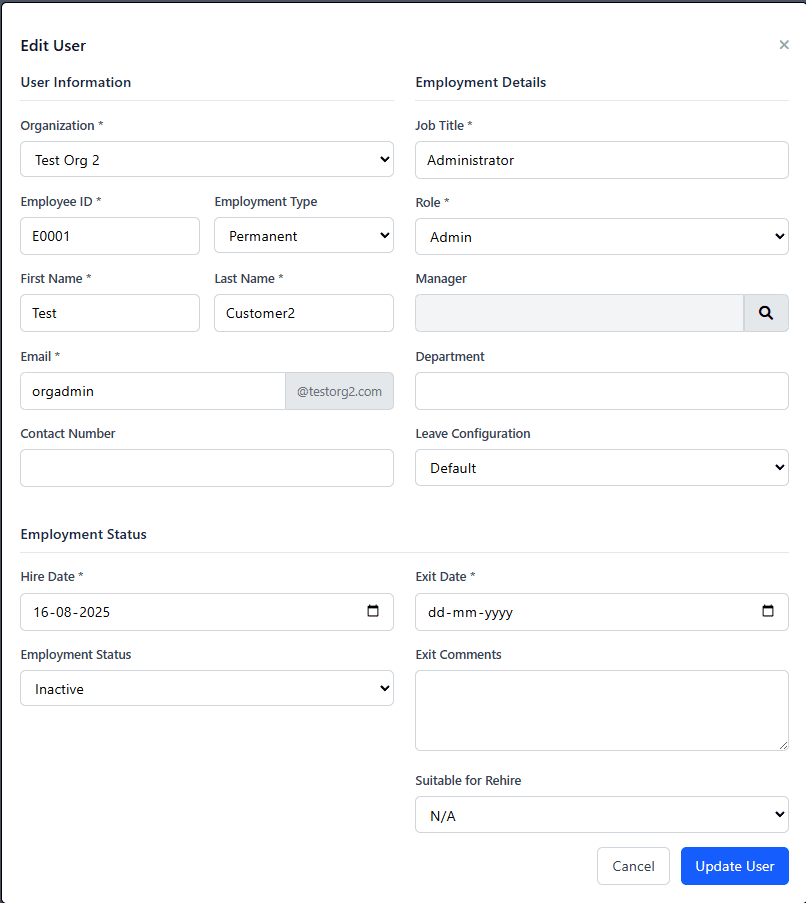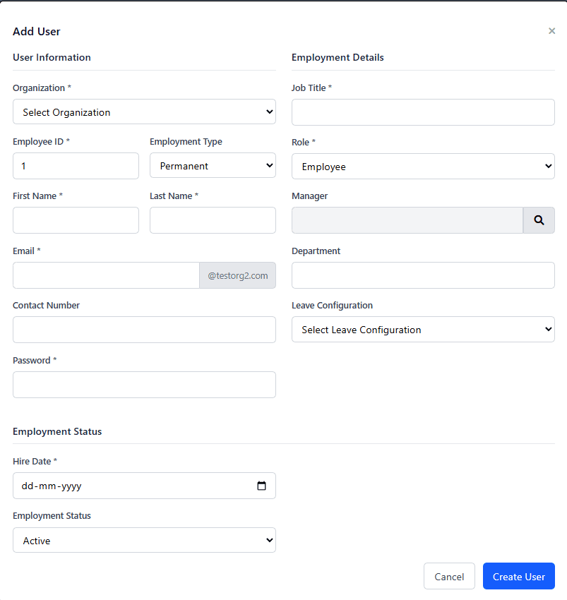 Enter user details (Employee ID, Name, Email, Role, etc.).