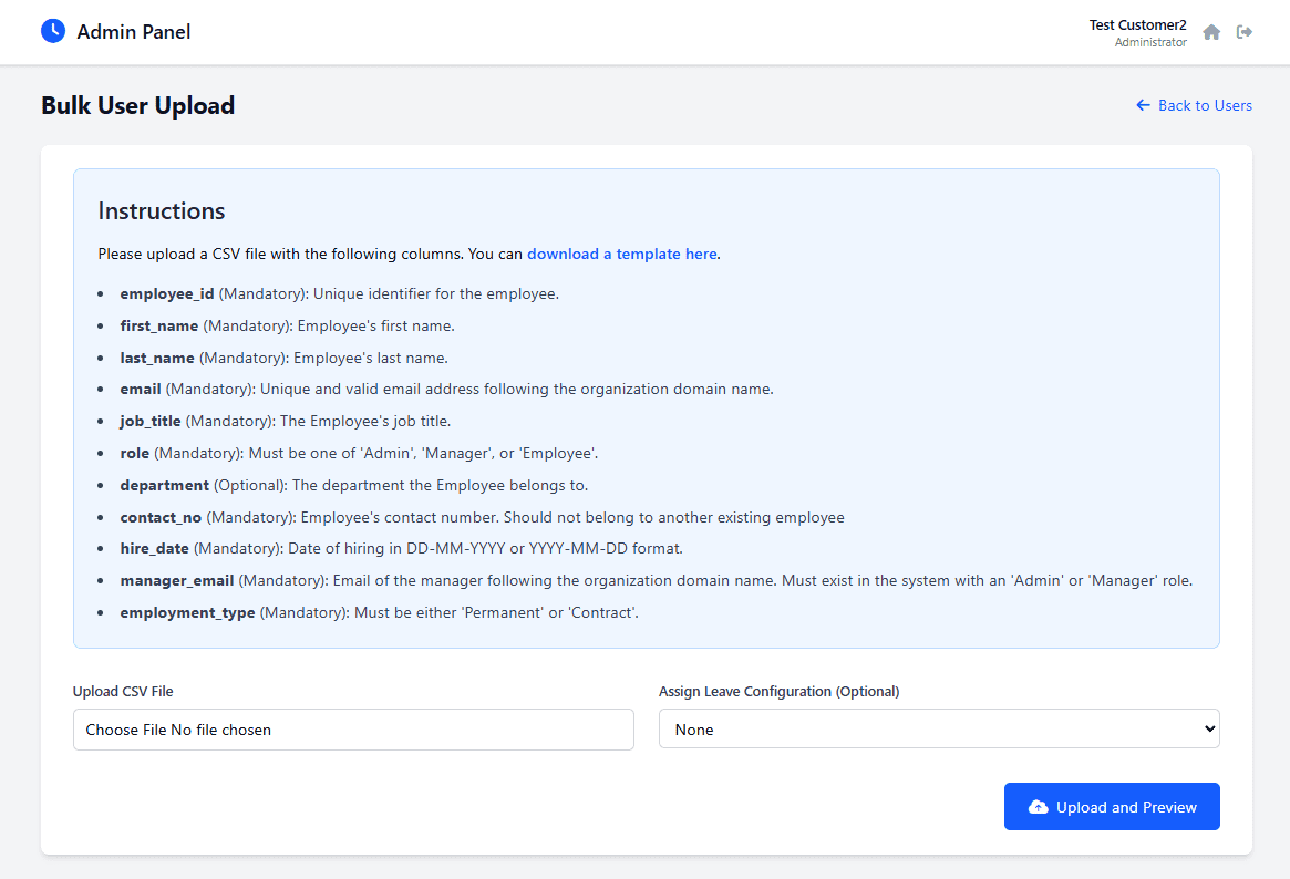 Click “Bulk Upload Users,” follow the instructions on the page.