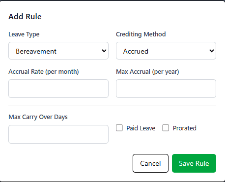 Set up detailed rules for how leave accrues and is managed for different employee groups.