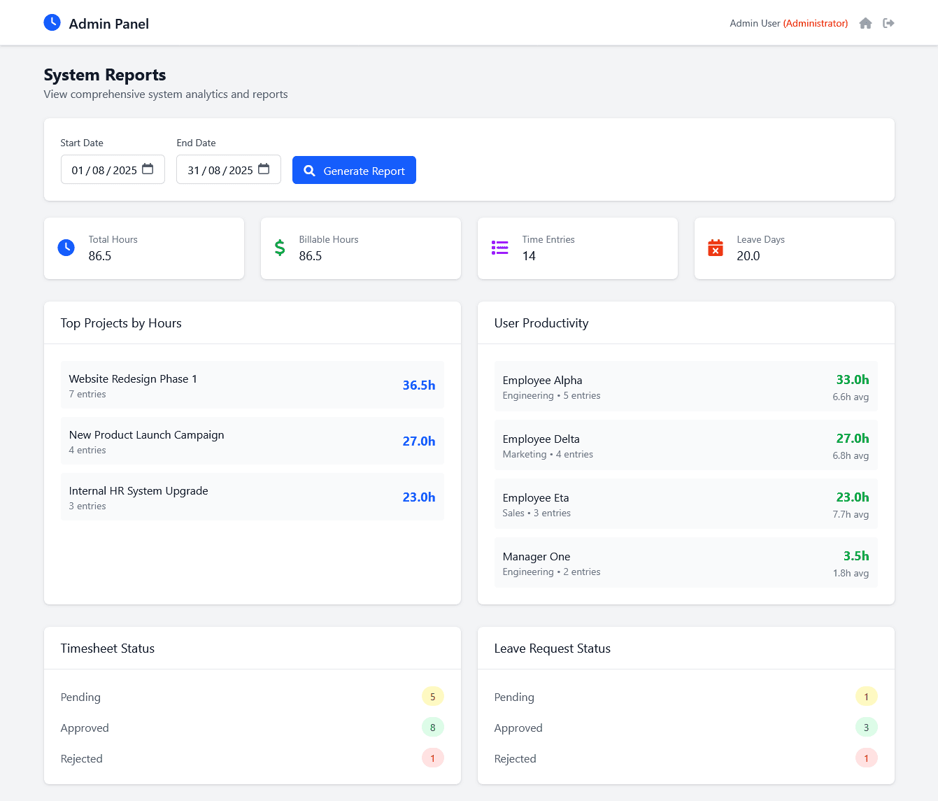 Generate and view various reports on time entries, leave, projects, and user productivity.
