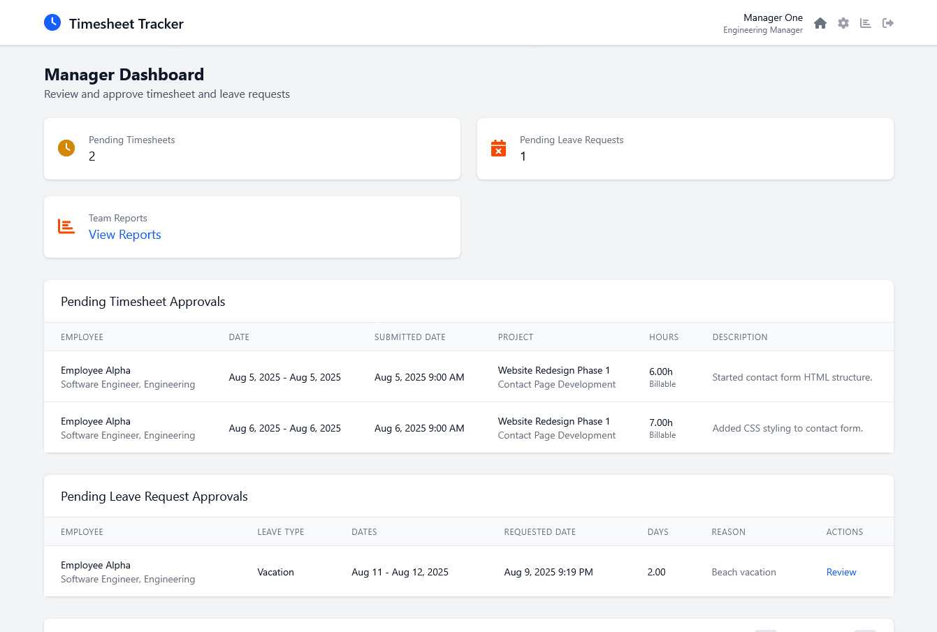 The Manager Dashboard provides a centralized view of your team’s activities and pending approvals.